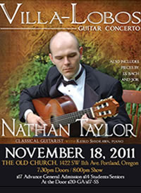 Classical Guitarist Nathan Taylor in Concert with Pianist Keiko Shiokawa. Program includes Heitor Villa-Lobos' Guitar Concerto with piano reduction, J.S. Bach's Lute Suite BWV 997 as well as works by Sor and Tarrega.